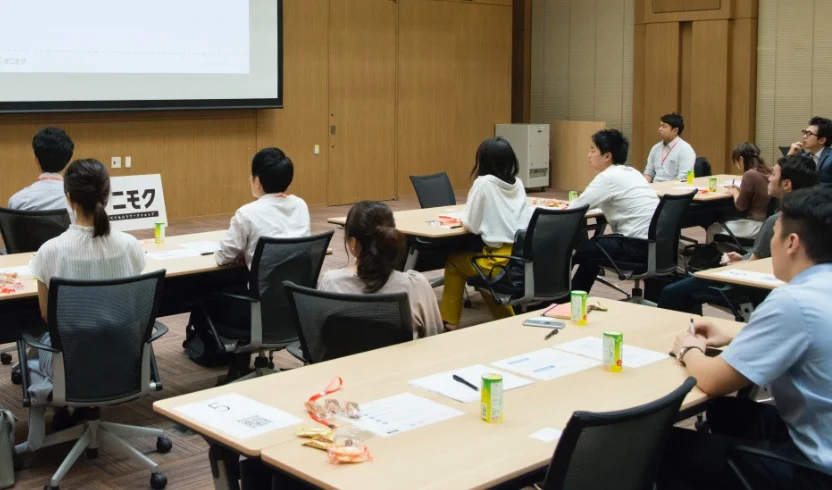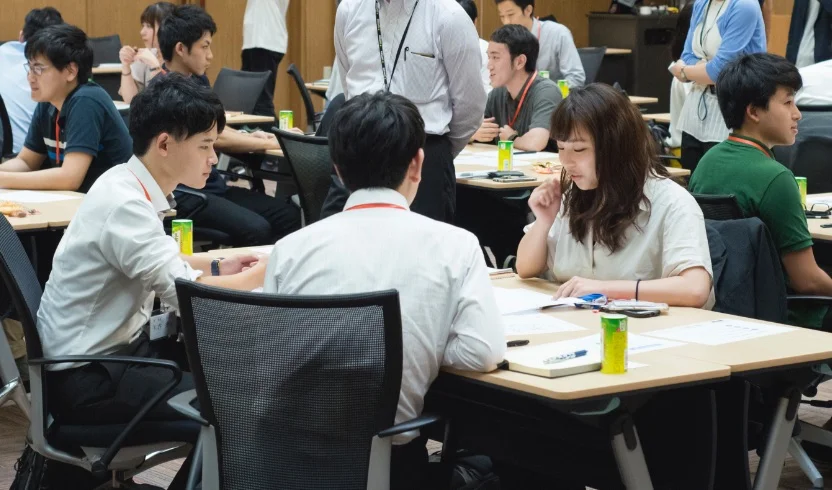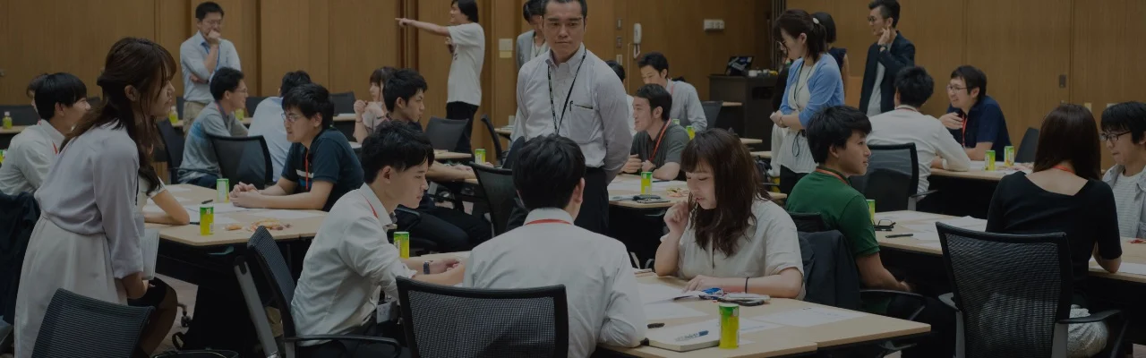 - 社外にも視野を拡げてもらうために、一般公募で他社の新卒社員を集めた。また、同じテーブルの3人は全員異なる会社になるよう席配置を行った